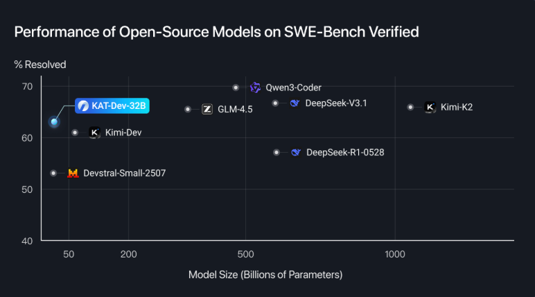 核心工作:快手团队发布了KAT系列两个模型——开源的KAT-Dev-32B(32B参数)与性能更强的KAT-Coder。在SWE-Bench Verified基准上,KAT-Dev-32B达到62.4%的问题解决率,位列开源模型第五;KAT-Coder则以73.4%的成绩创下当前最优水平。