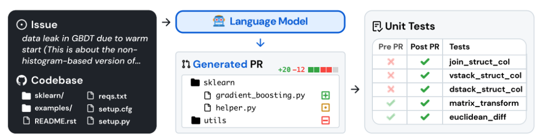 - 真实任务集:从12个高星Python仓库提取2,294个真实问题,每个任务需理解完整代码库(平均43.8万行)、跨文件定位bug并生成通过单元测试的补丁,远超HumanEval等简化基准