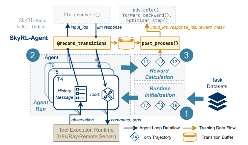 本文提出SkyRL-Agent,一个面向多轮次、长周期LLM智能体的高效强化学习训练框架。核心创新在于异构调度系统与工具增强训练的协同设计: