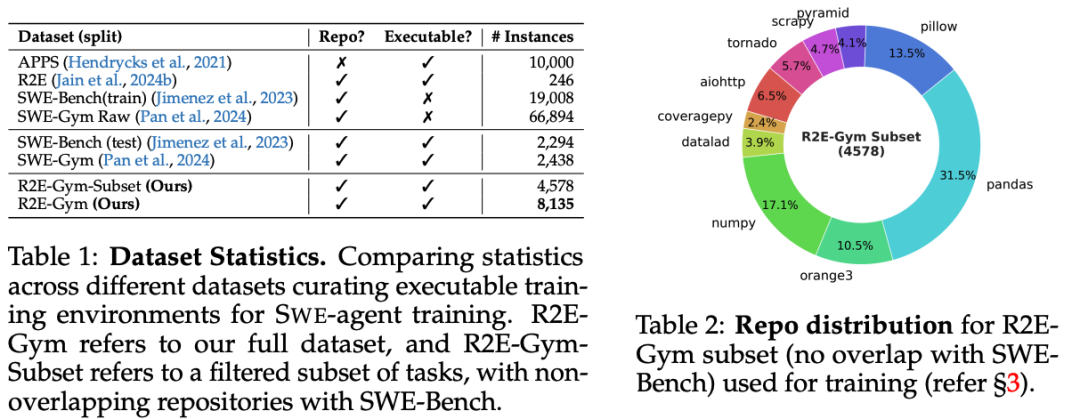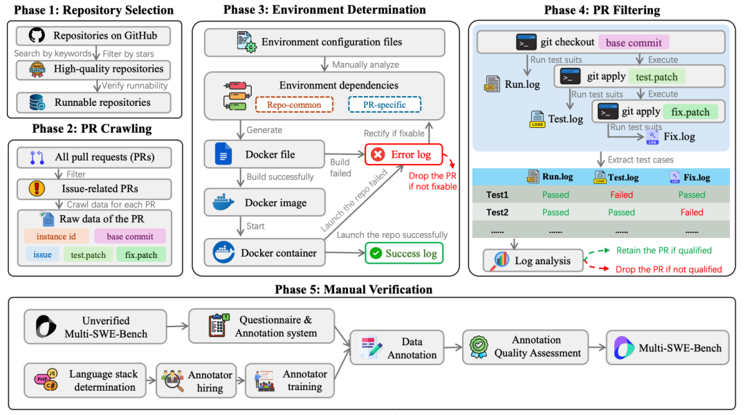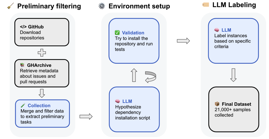 - 四阶段自动化流水线:覆盖任务收集、环境配置自动化、执行验证与质量评估,31%仓库成功生成可执行环境,较手动方法显著扩大规模与多样性