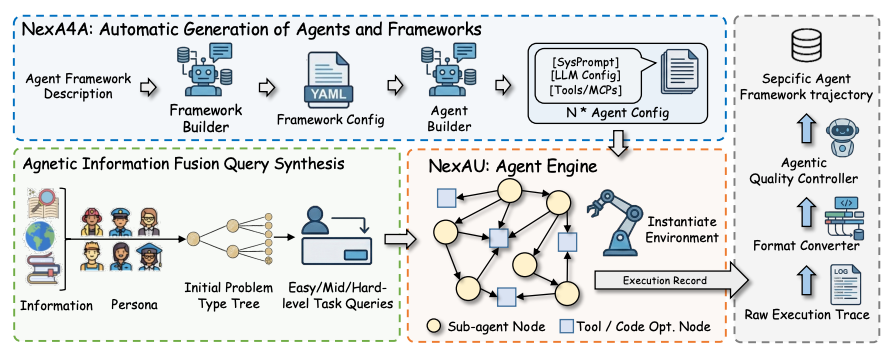 - NexA4A:生成式框架合成系统,基于自然语言描述自动产出完整代理拓扑结构(系统提示、子代理节点、工具绑定),可程序化生成 200+ 异构框架(1–34 节点深度),覆盖从单代理到多层级联的无限交互模式。