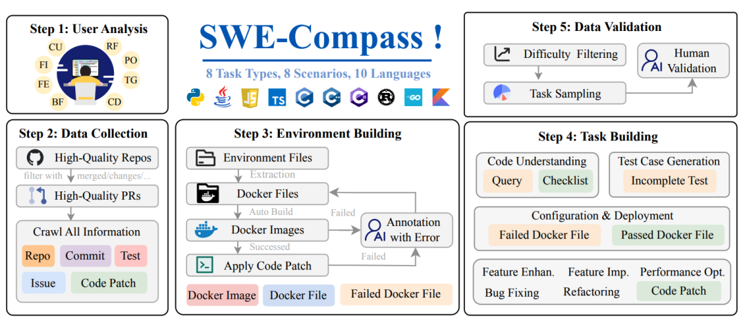 现有软件工程基准测试存在任务覆盖窄、语言偏向性强、与真实开发流程脱节等问题。为此,本文提出SWE-Compass,整合2,000个来自GitHub真实PR的高质量实例,构建首个覆盖8类任务(功能实现、重构、性能优化、测试生成等)、8个编程场景(应用开发、基础设施、机器学习、安全工程等)及10种语言的统一评估框架。