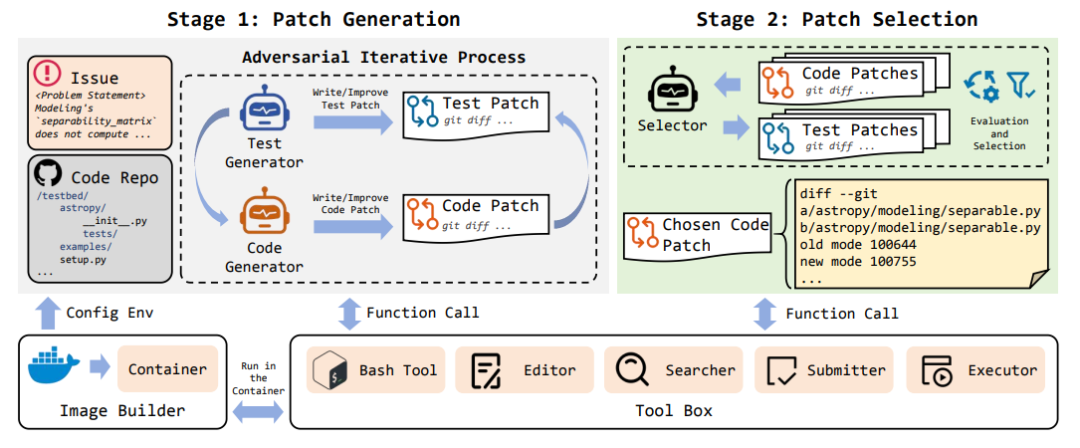 InfCode提出对抗式多智能体框架,通过测试补丁与代码补丁生成器的迭代互搏解决仓库级缺陷修复中验证信号弱、补丁易过拟合的问题。Test Patch Generator持续构造更强测试用例以暴露缺陷,Code Patch Generator则针对性改进代码,形成动态强化闭环;Selector智能体最终在容器化环境中评估多候选方案,筛选最可靠补丁。