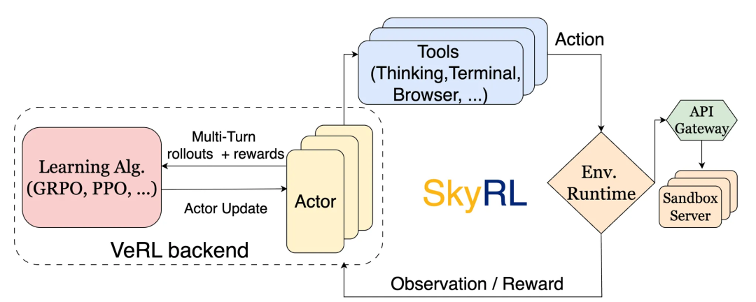 核心创新在于系统级效率提升:一是解耦式远程沙箱服务器,将环境执行与训练分离,支持独立扩展,避免资源争用;二是异步并行rollout配合三阶段生产者-消费者流水线,重叠计算与环境交互,实现4-5倍加速。