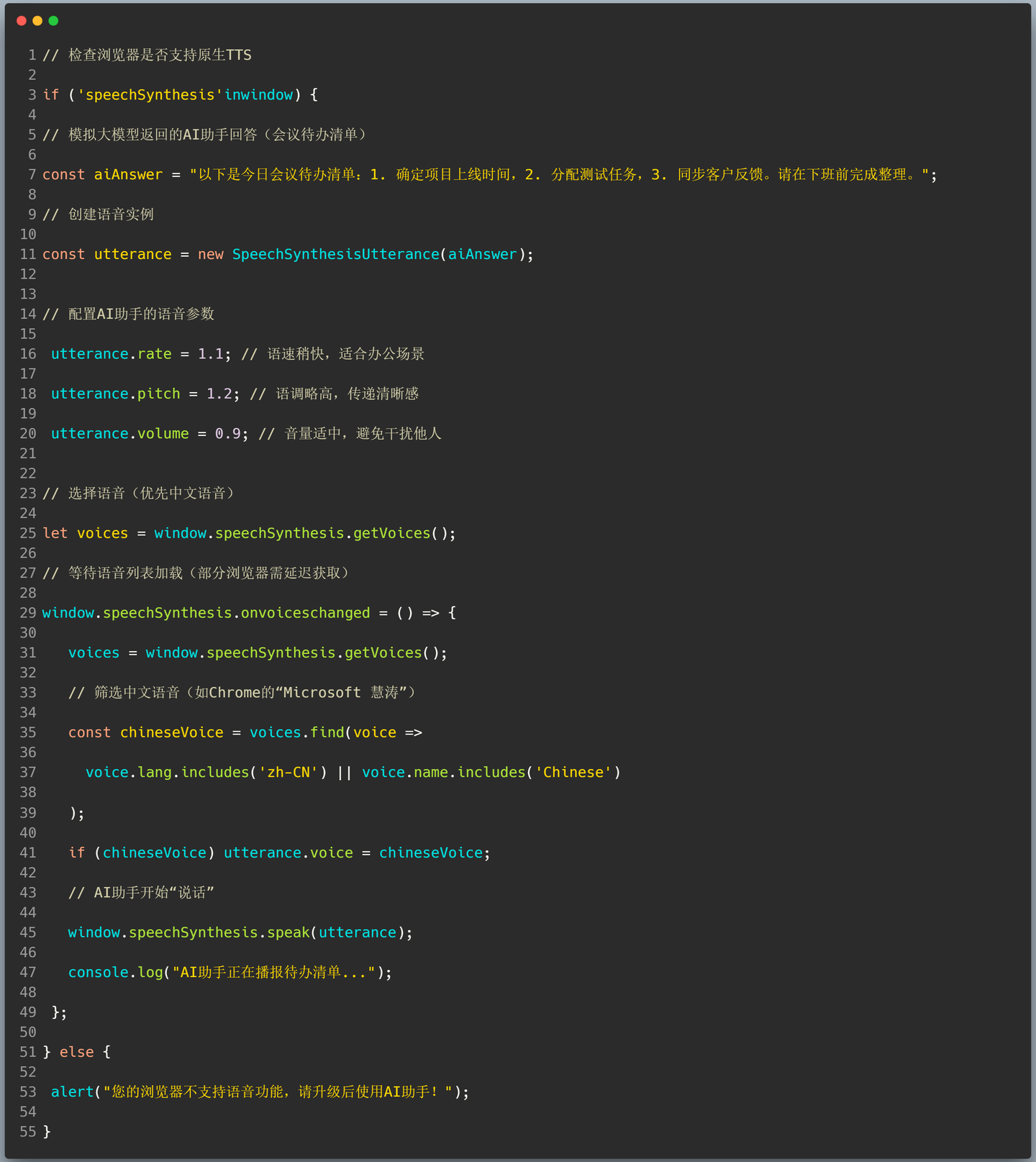 以下是简易办公 AI 助手的 TTS 实现代码 —— 当大模型生成 “会议待办清单” 后,AI 助手自动用语音播报: