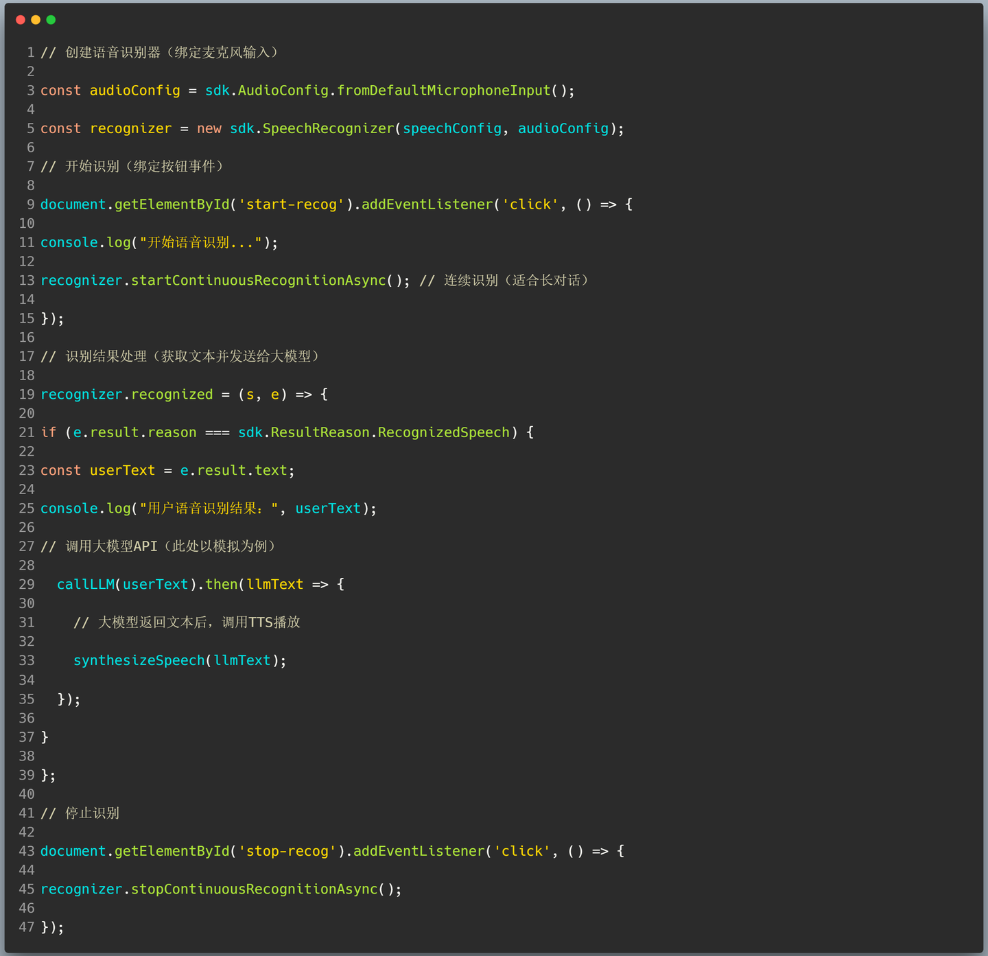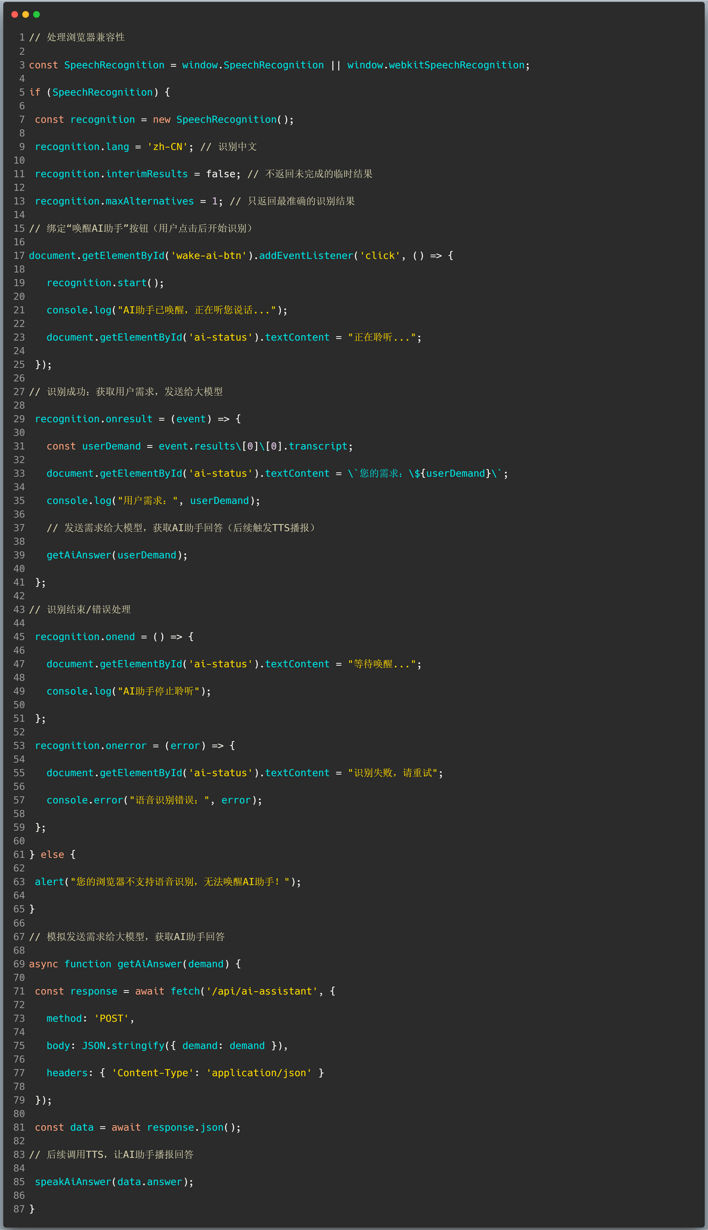 要让 AI 助手 “听懂” 用户的语音需求,可使用浏览器内置的 SpeechRecognition 接口(Chrome 中需加 webkit 前缀),将用户口语转为文本,再发送给大模型。