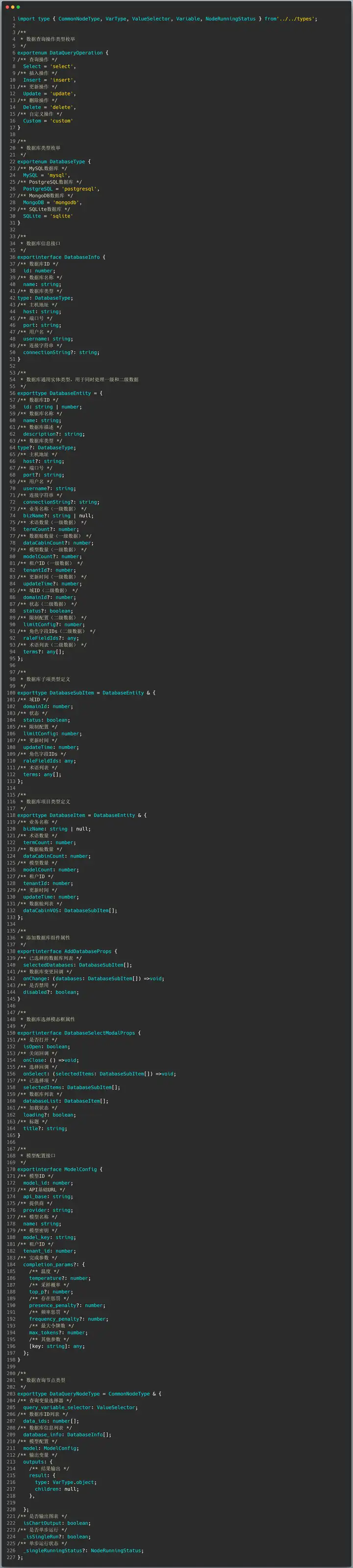 基于此流程,AI 生成的 data-query/types.ts 代码如下,已预设数据库操作枚举与节点数据结构,且标注字段约束条件: