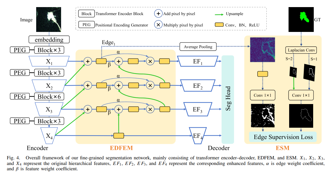 通过垂直级联和逐像素加权计算,边缘信息被逐层加强。这些被增强后的特征(EF_i)就像被“放大”了边界对比度的信号,能更清晰地界定矿区与背景 。
