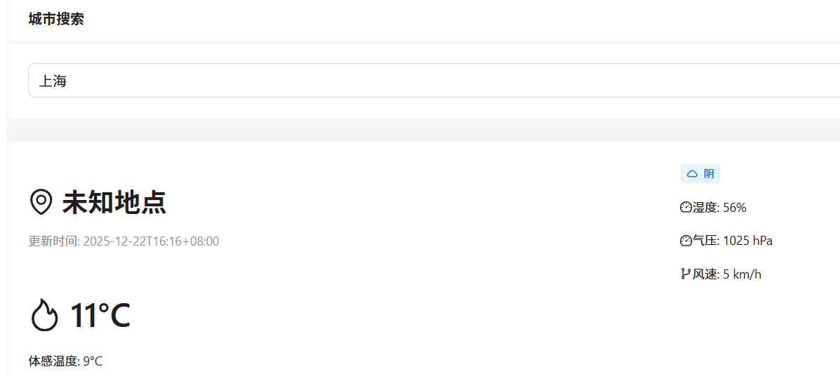 - WeatherCard 自动更新显示新的城市名称和天气信息