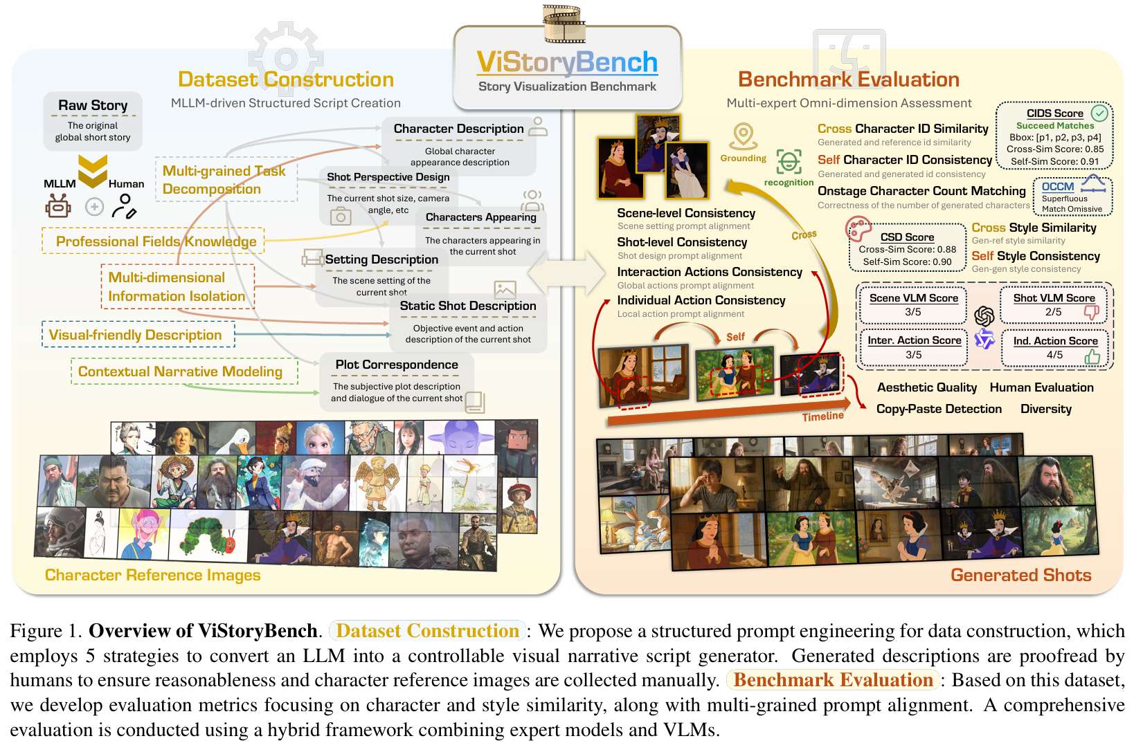 首个全能故事可视化基准:ViStoryBench 是一个全面的基准测试套件,涵盖80个多镜头故事、10种视觉风格和1300+个分镜,旨在评估模型在复杂叙事结构、视觉风格和角色设定下的生成能力。