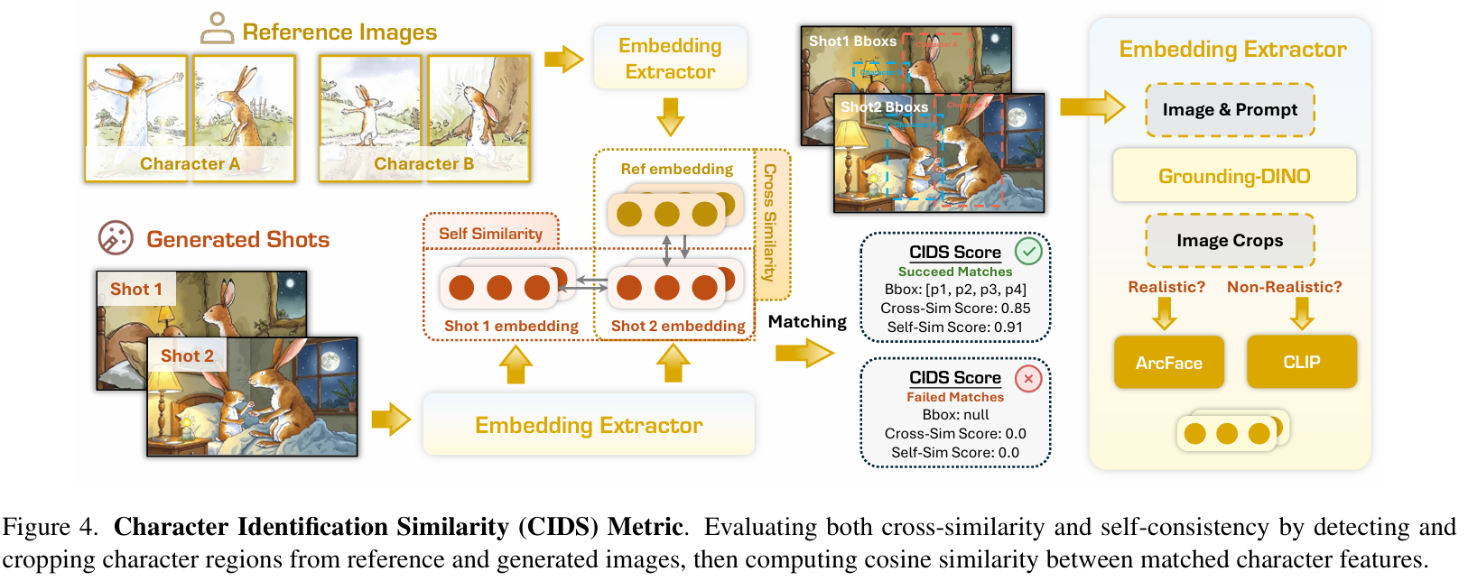 角色识别相似度(CIDS):检测角色并提取特征,计算生成图与参考图(Cross)及生成图之间(Self)的余弦相似度。