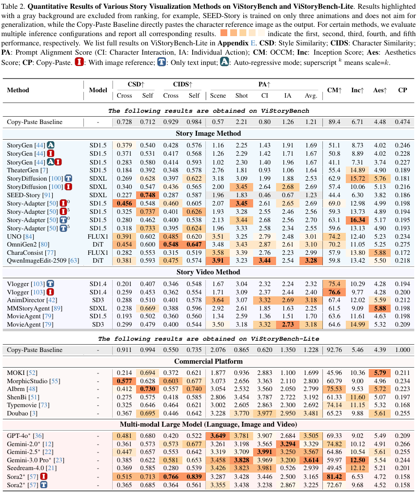30+主流模型大考:评估对象涵盖开源图像生成(StoryDiffusion, OmniGen2)、商业闭源模型(MOKI, Doubao, MorphicStudio)、多模态大模型(GPT-4o, Gemini)及视频生成模型(Sora2, Vlogger),揭示不同技术路线的结构性优势与短板。