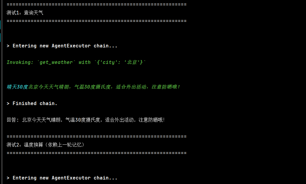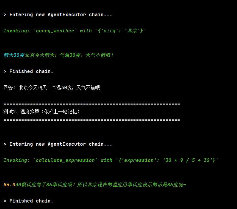 result = agent_executor.invoke({"input": "北京天气如何?如果温度是30度,转成华氏度是多少?"})