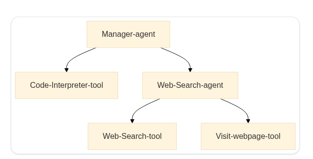 下图展示了一个简单的多智能体架构,其中一个 管理者智能体 协调一个 代码解释器工具 和一个 网页搜索智能体,而后者又利用像 DuckDuckGoSearchTool 和 VisitWebpageTool 这样的工具来收集相关信息。