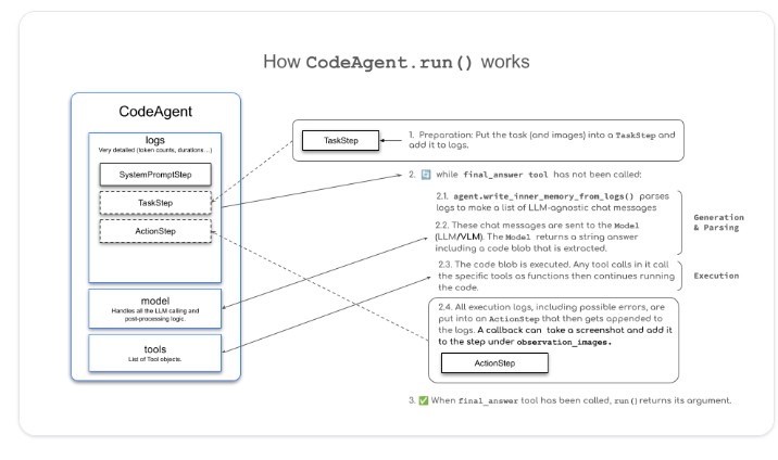 上图展示了 CodeAgent.run() 的工作方式,它遵循了我们在第一单元中提到的 ReAct 框架。smolagents 中 Agent 的主要抽象是 MultiStepAgent,它是核心构建块。CodeAgent 是一种特殊的 MultiStepAgent,我们将在下面的例子中看到。