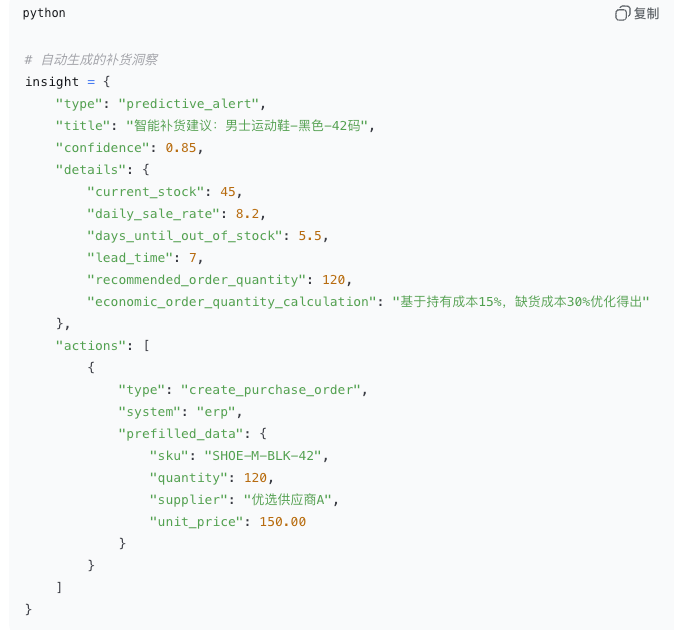 预测洞察:当预测某SKU在未来7天内缺货概率>80%时: