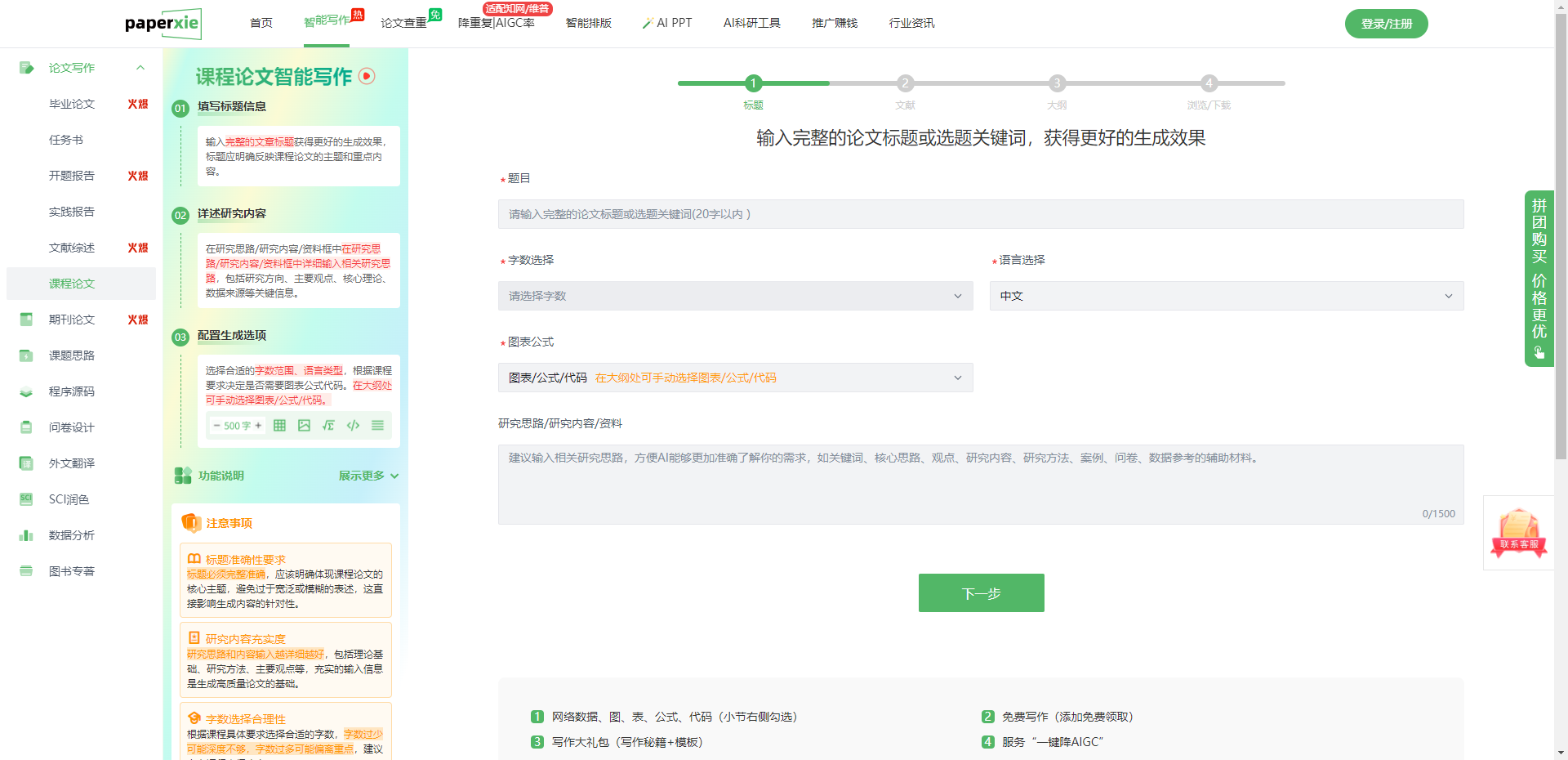 打开 PaperXie 左侧导航栏的 “课程论文”(和开题报告、文献综述并列,标了 “高频” 标识),跟着流程走,1 小时就能出初稿: