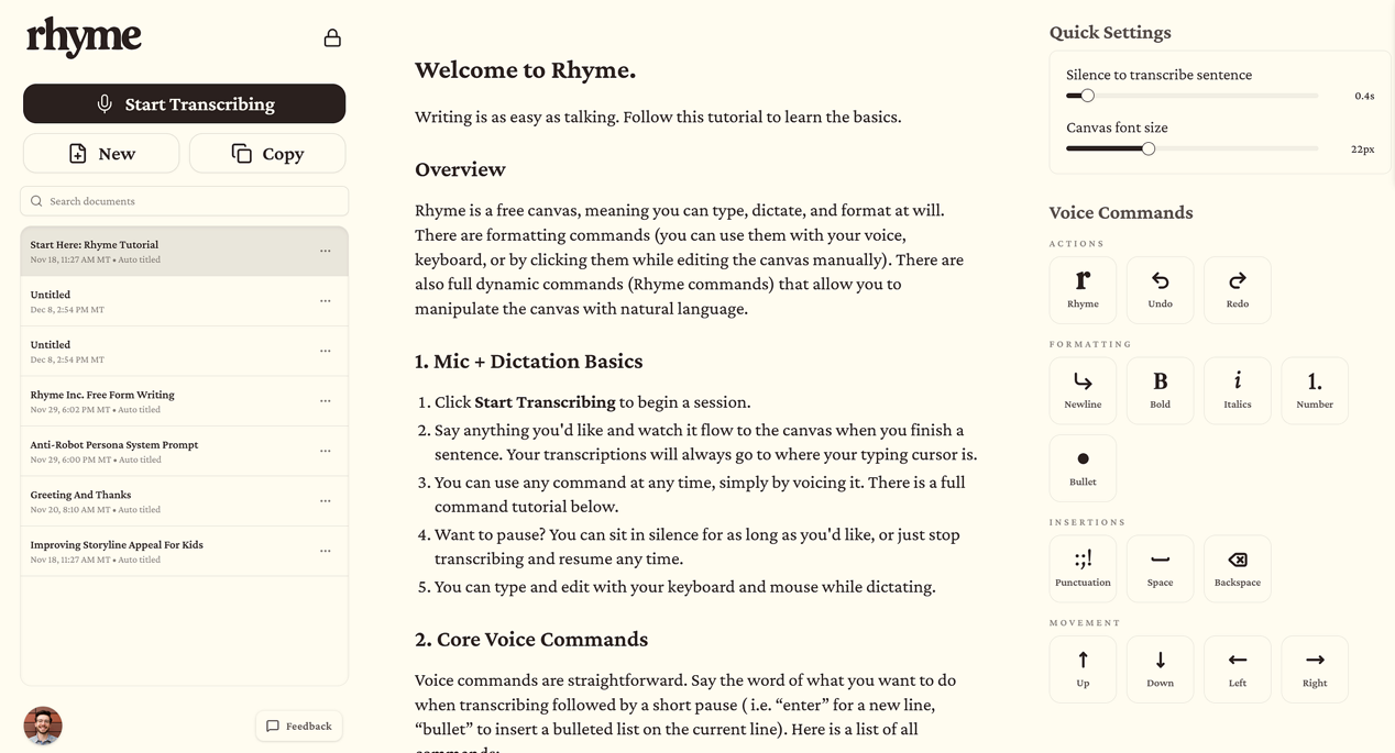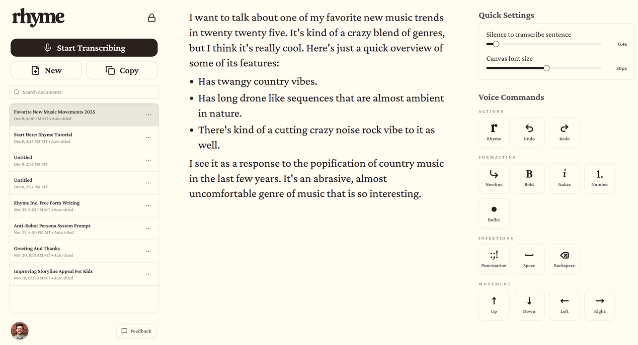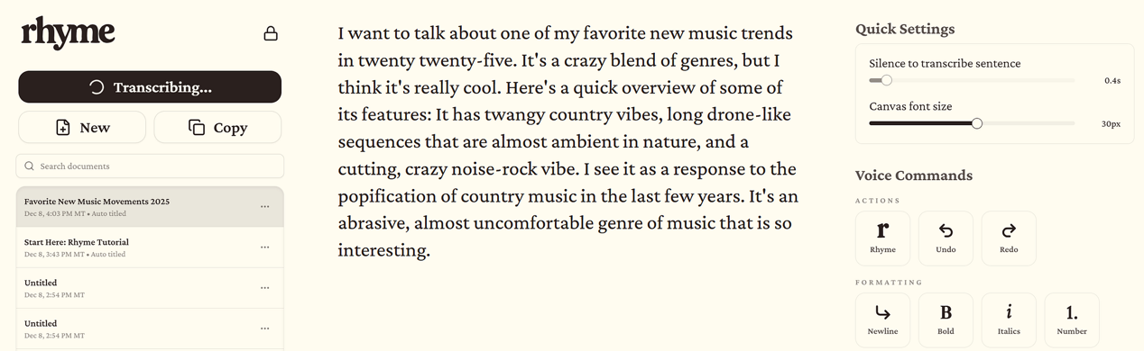 我可以说话,Rhyme会在我说话时插入我的句子。我还可以通过语音命令添加空格、项目符号和各种其他格式: