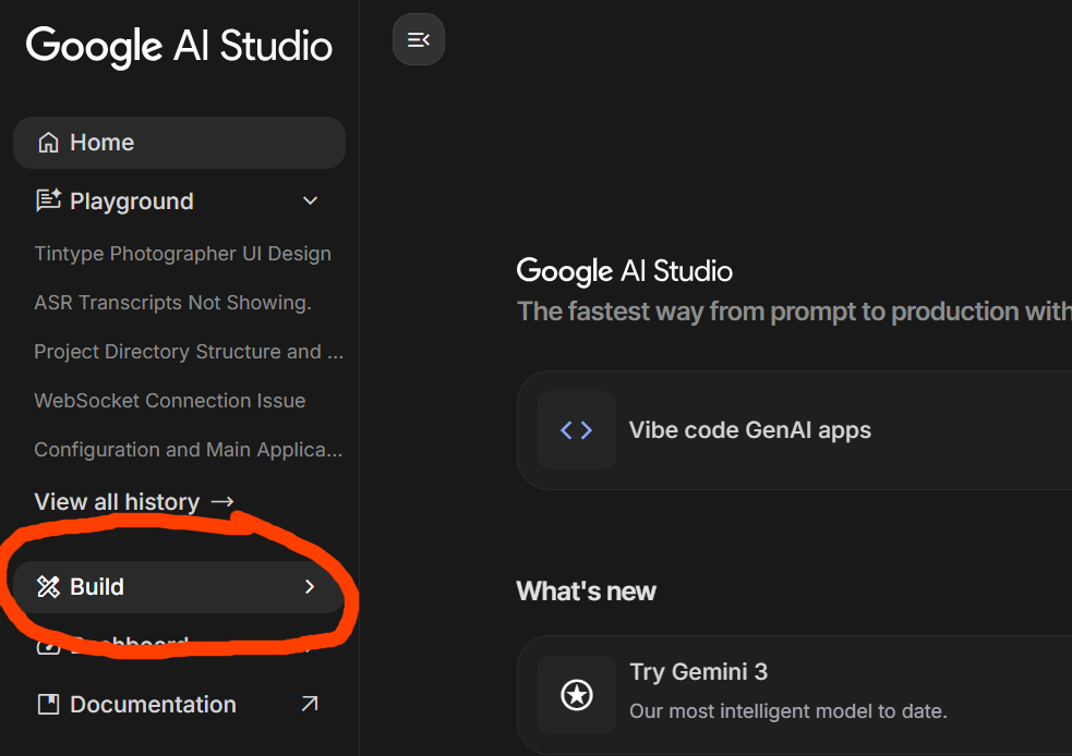 访问https://aistudio.google.com/并注册一个免费账户,然后点击侧边栏中的“构建”开始使用。