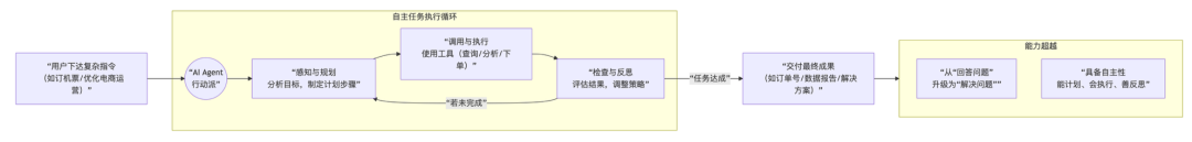 这背后有一个复杂的工作流程:感知目标、分析需求、制定计划、调用工具、执行动作、查看结果、调整策略。