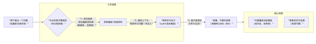 这个管理员的工作是什么?就是当有人问问题的时候,管理员会立即去最新的资料库里找相关的资料,然后把这些资料和书呆子一起关进小黑屋,让书呆子基于这些新资料来回答问题。