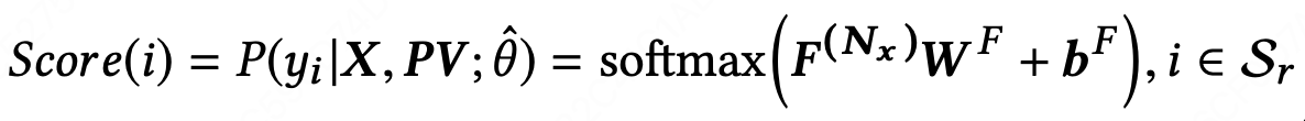 输出层的功能主要是为每个item(i = i1, . . . , in)生成一个score,在图1b中标记为score(i)。我们使用一个线性层,后跟一个softmax层。softmax层的输出是每个item的点击概率,这里将其标记为P(yi|X,PV;θˆ)。我们用P(yi|X,PV;θˆ)作为score(i)为items进行重排序。score(i)的公式为: