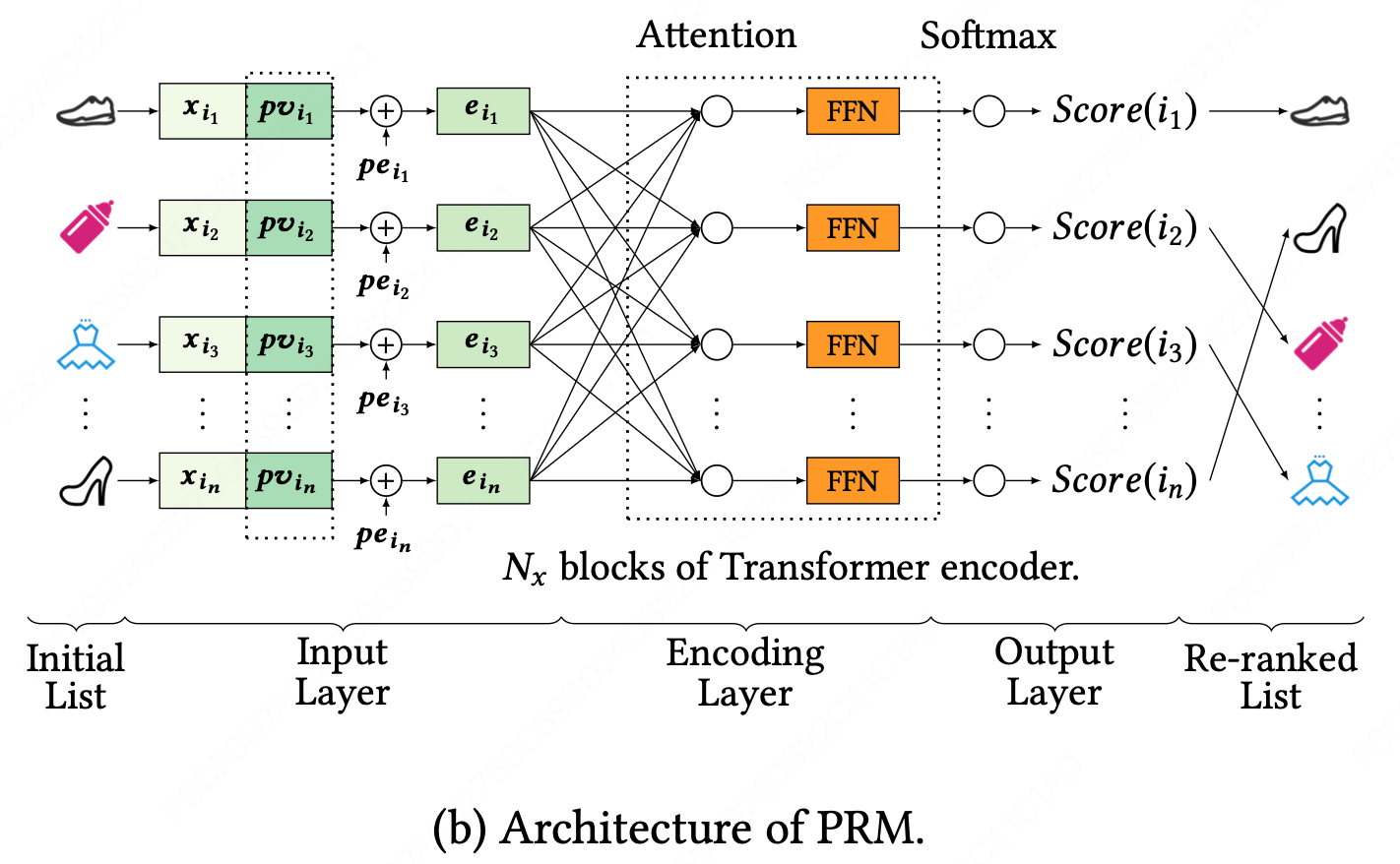 PRM模型由三部分组成:input layer、encoding layer、output layer。它将前序排序方法生成的item的初始列表作为输入,并输出一个重排后的列表。