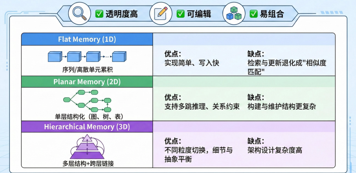 | Flat Memory (1D) | 序列/离散单元累积 | 实现简单、写入快 | 检索与更新退化成"相似度匹配" |