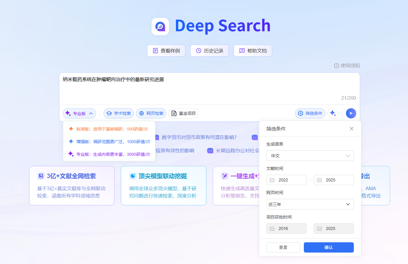 2. 善用“版本选择”:DeepSearch 提供标准版、增强版、专业版。对于深度调研,建议选择增强版或专业版,它们检索的范围更广,生成的内容更详尽,找到代表性文献的几率更大。