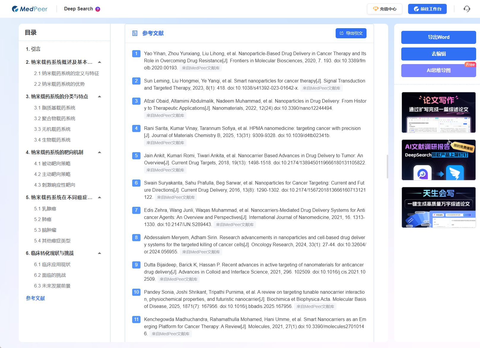 4. 与“科技文献”配合使用:你可以用 DeepSearch 快速绘制“地图”,锁定一批候选代表性文献。然后,将这些文献的标题或DOI放到MedPeer的“科技文献” 模块中进行精查,利用其期刊分析、作者分析等功能,再次验证其影响力,并查看它们的详细参考文献列表,进行第二轮扩展。