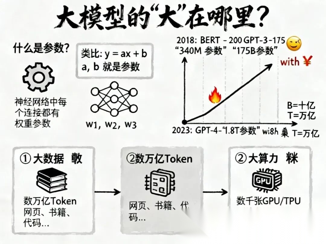 为什么现在的模型叫“大”模型(Large Language Model)?这个“大”不仅仅是体积大,更是量变引起质变的关键。