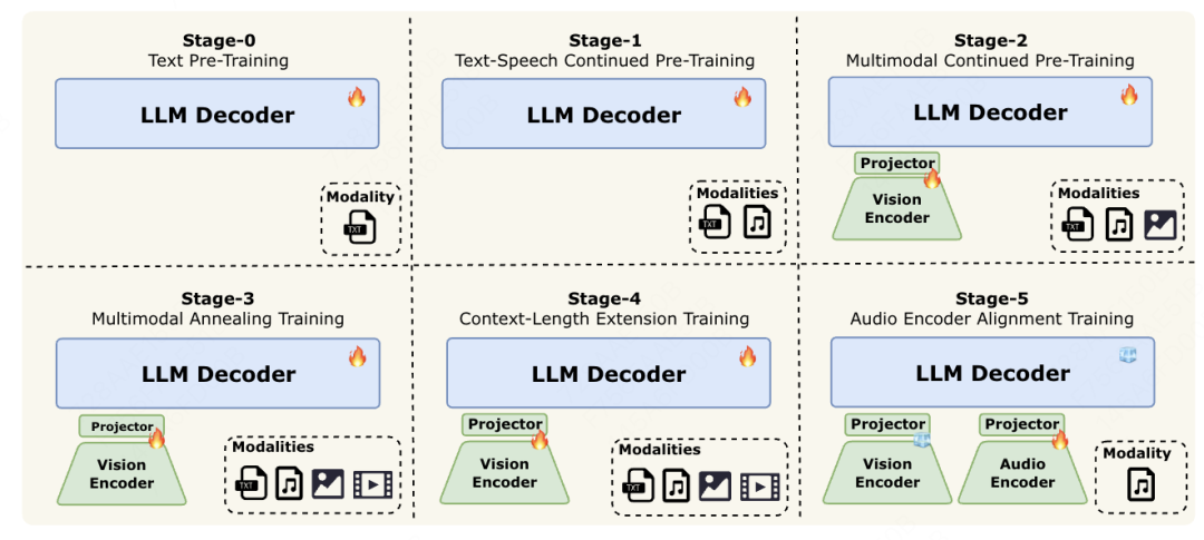 全模态模型的最大难题是——不同模态的数据分布完全不同。Omni 的解决思路是 渐进式早期多模融合训练(Progressive Early Fusion)。