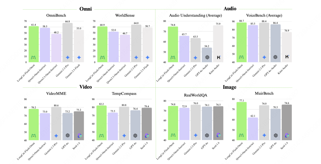 在综合评估(Omni-Bench、WorldSense)中,LongCat-Flash-Omni 达到了开源最先进水平(SOTA)。