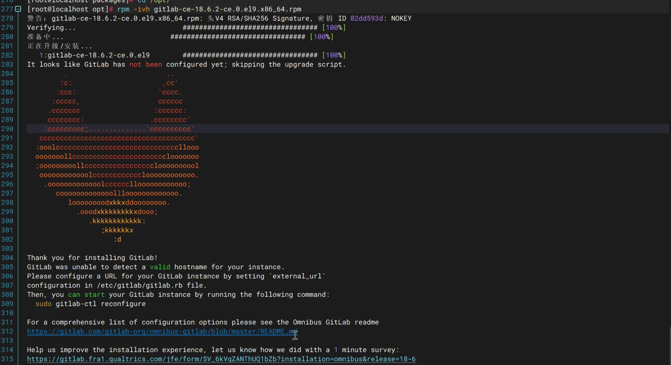 mv gitlab-ce-xxx.rpm /opt/ rpm -ivh gitlab-ce-xxx.rpm安装