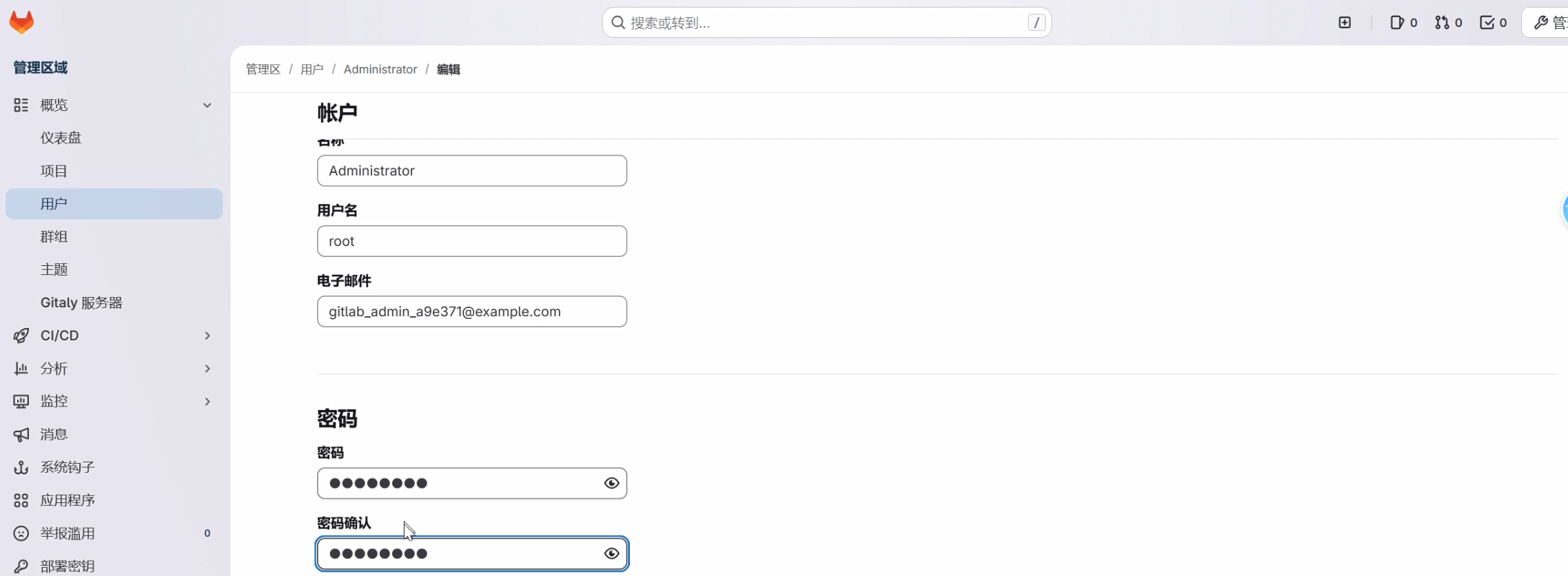 cat /etc/gitlab/initial_root_password 登录用户:root