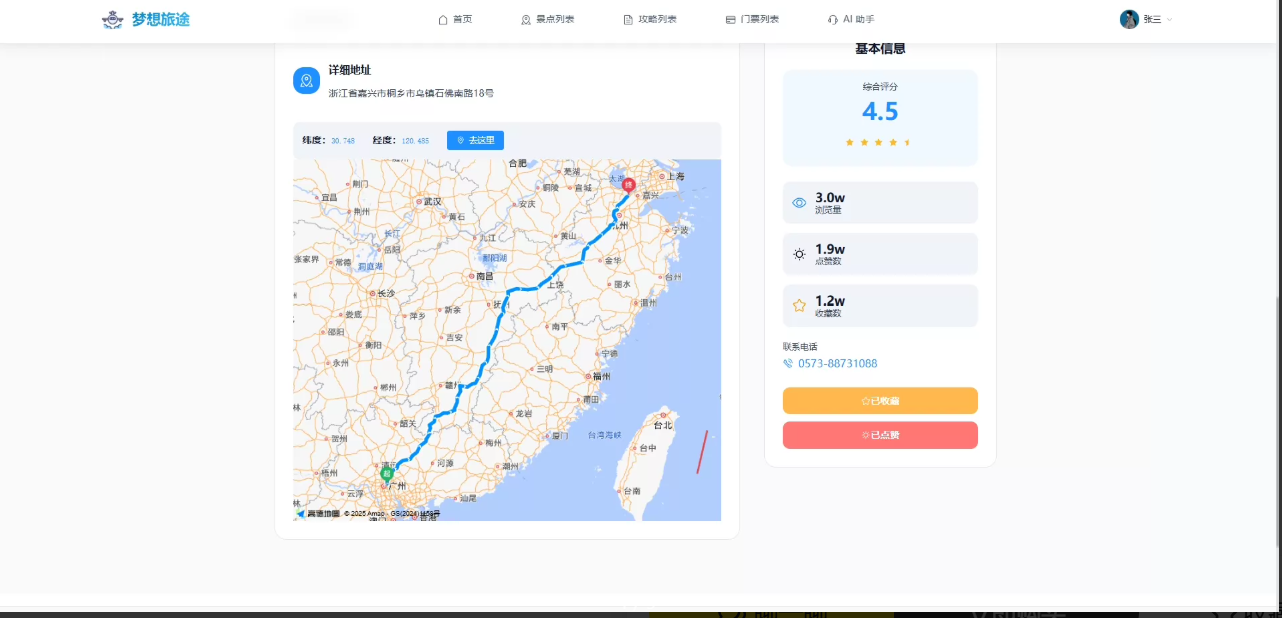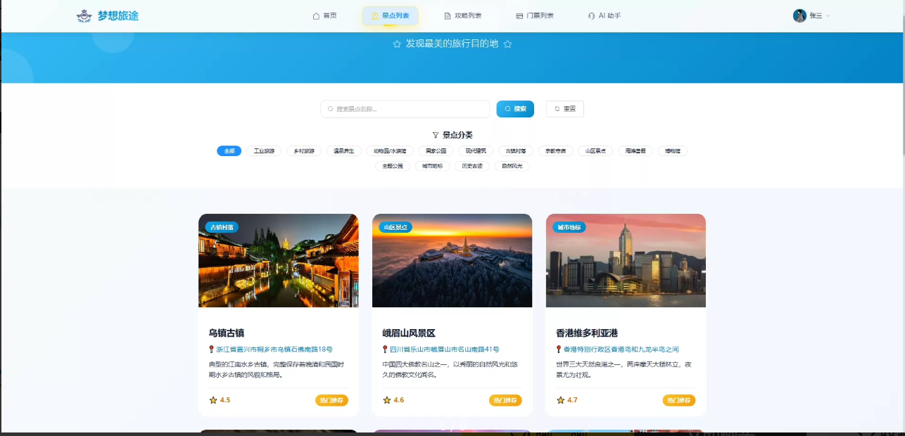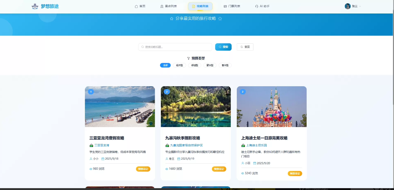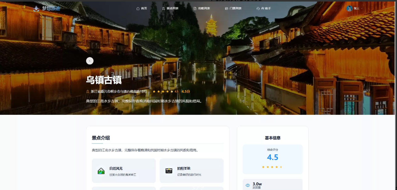 基于SpringBoot和Vue3的AI旅游攻略平台项目,正是为应对这一市场需求而设计。项目采用前后端分离架构,后端使用SpringBoot构建高可用微服务,提供稳定的数据接口和AI算法支持;前端基于Vue3框架,利用其响应式特性和组件化优势,打造流畅交互的用户体验。平台整合了自然语言处理、推荐算法和数据分析等AI技术,能够根据用户的出行时间、预算偏好、兴趣标签等多维度信息,自动生成定制化旅游路线,实现“千人千面”的智能攻略推荐。