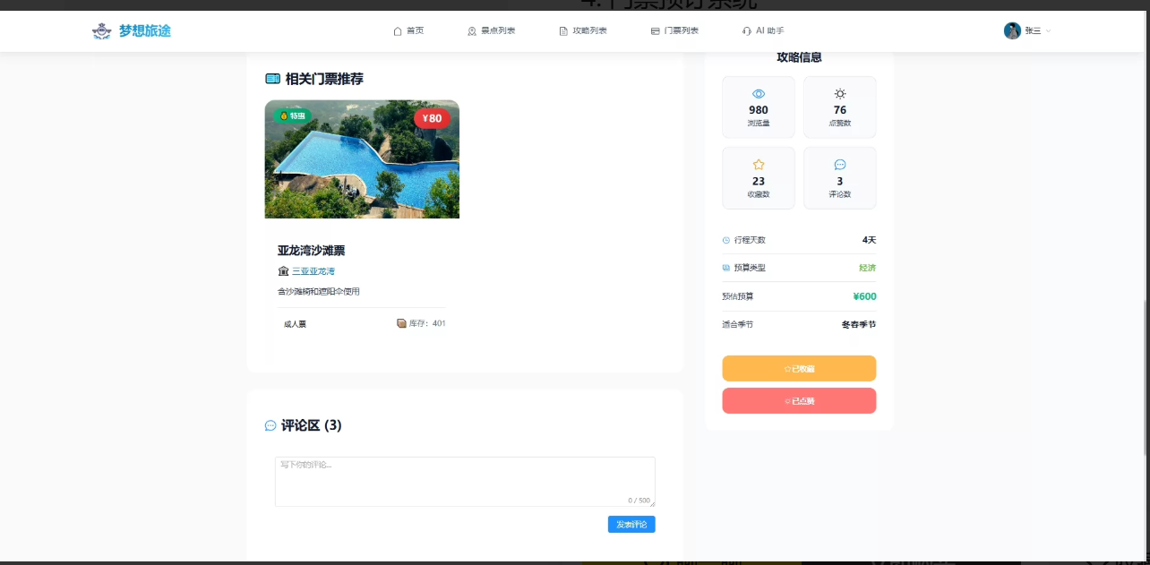 AI技术集成:在AI核心能力方面,平台通过SpringBoot的后端服务集成Python构建的智能推荐微服务(或直接调用第三方AI API),利用协同过滤、内容推荐等算法模型,并结合自然语言处理技术解析用户输入的模糊需求,从而实现旅游攻略的个性化生成与精准推荐。各技术栈之间通过清晰的接口定义进行通信,共同构成了一个功能完整、技术先进的智能旅游解决方案。