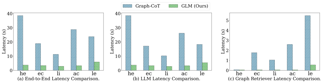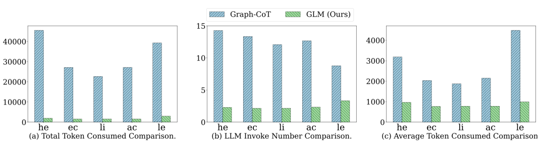 为深入理解这一改进的来源,研究团队进一步通过两个维度分解token消耗:(1)单次查询的平均LLM调用次数;(2)单次调用的平均token消耗量。结果显示,GLM每个实例仅需2~3次LLM调用,单次调用约消耗769~991个token;而Graph-CoT每个查询需执行9~14次调用,单次调用消耗1,875~4,483个token。这些结果表明,GLM****通过同时降低 LLM 调用频率和单次调用的token数量,大幅提升了推理效率。