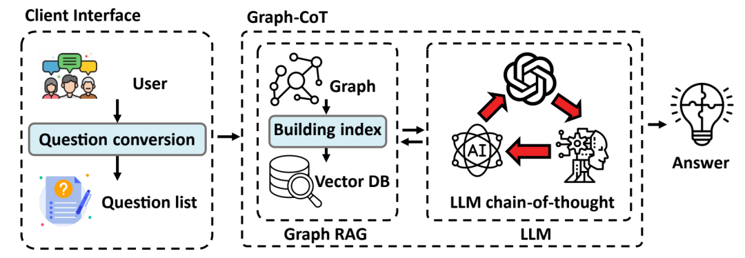 为弥补这一局限,Graph-CoT通过LLM推理与图检索来扩展RAG(如图1所示),实现了LLM与图数据之间的迭代交互。Graph-CoT允许LLM迭代地查询图节点、检查属性、探索相邻节点并沿着图结构积累证据。