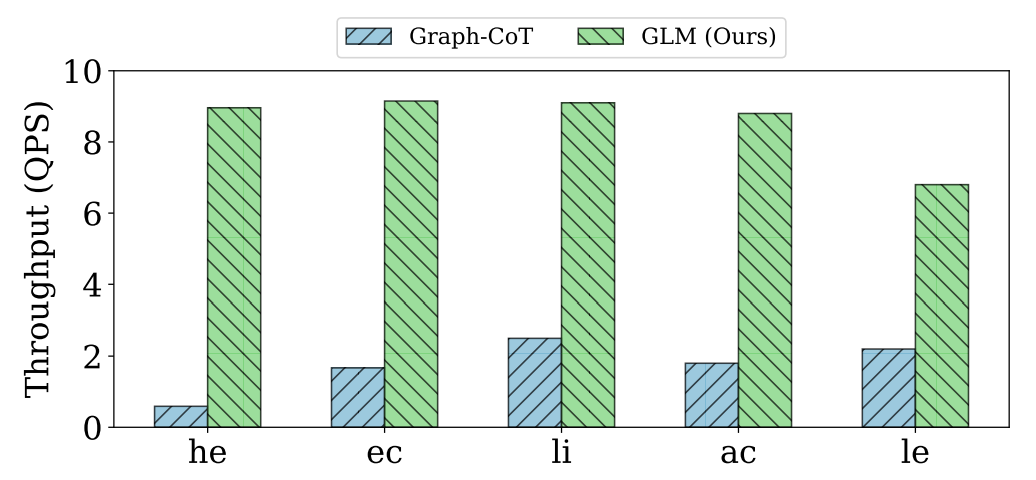 吞吐量评估如图14所示,吞吐量定义为每单位时间内处理的问答对数量。Graph-CoT每秒仅处理0.6 ∼ 2.2个查询。相比之下,GLM 实现了更高的吞吐量,每秒能够处理6.8 ∼ 9.1个查询,相比Graph-CoT可实现3.2倍至15.1倍的吞吐量提升。