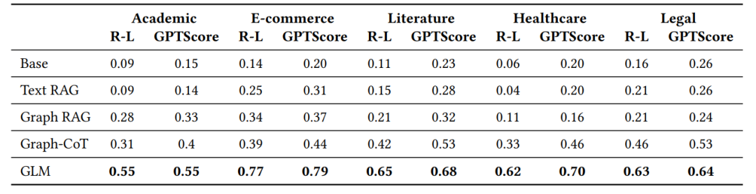 GLM 相较于所有基线方法在准确率上的提升效果如表 4 所示。实验结果表明,GLM 在所有评测基准上均取得显著且稳定的性能优势。GLM 相较于Base LLMs准确率提升了60%,相较于 Text RAG 提升了62%,相较于Graph RAG提升了55%,相较于 Graph-CoT 提升了 38%。