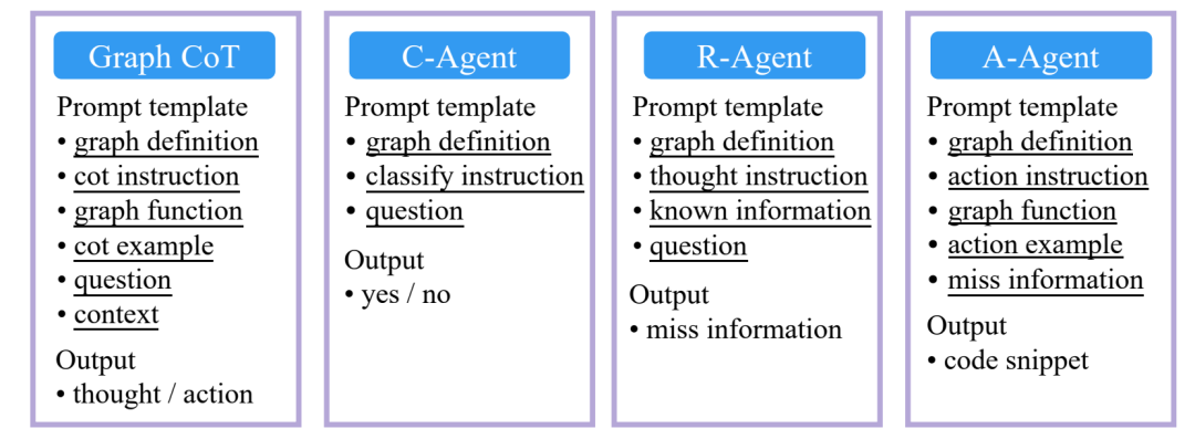 动作智能体(A-Agent):负责生成可执行的 Python 代码片段,以获取推理智能体所识别出的缺失信息。与以往的 Graph-CoT 系统将操作限制于预定义功能不同,该智能体能够生成多个函数组合、基础控制结构(if-else、for)及标准数据类型(set, list, dict)的表达式。这使得复杂的推理任务可以在单次执行中完成,减少了多轮交互。智能体通过print()语句仅输出必要结果,避免冗余的中间上下文信息。