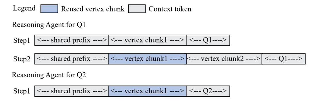 面对非确定性查询时,notebook能够在多轮迭代中会逐步从Graph RAG中积累信息。如图7所示,首次迭代会检索特定节点关联的顶点块。推理智能体处理该顶点块(vertex chunk 1)时生成对应KV缓存。由于notebook能够持续保留这些信息,同一顶点块在后续迭代中仍保持关联性,使得其KV缓存可被复用,从而消除冗余计算。