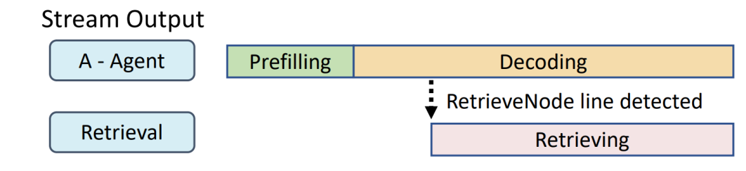 如图9所示,该策略的核心思想是将检索器执行过程与动作智能体的第二阶段流水线化。绿色部分代表LLM的预填充阶段,黄色部分对应初始解码阶段(包含RetrieveNode函数调用的解码)。一旦该调用被解码,系统立即触发检索过程。当检索器执行时(粉色段所示),LLM同时解码剩余token。虚线箭头展示了检索执行与token生成的重叠区域,这种重叠正是流水线策略的基础,能有效隐藏检索延迟并提升多智能体执行的整体吞吐量。