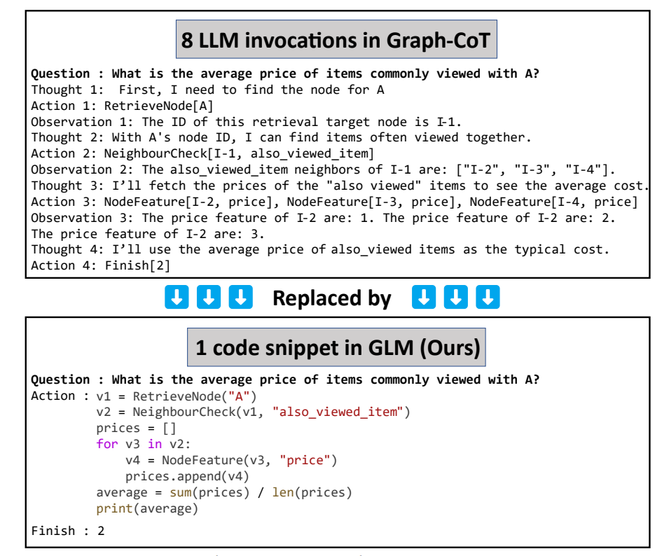 如图6所示,对于需要从多个顶点获取信息的查询,单个代码片段可在一轮推理中调用多个图函数,从而减少交互步骤。对于涉及中间计算的查询,该代码片段可在内部执行本地数据处理(例如,求平均值或交集),避免了冗余的中间结果存储并降低推理开销。这种优化有效减少了每条查询所需的推理轮数和总token消耗。