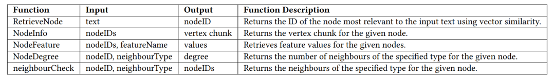 表 2 总结了所有核心函数。研究团队在 Graph-CoT的检索接口基础上进行了扩展,新增了 NodeInfo() 函数,用于提供以顶点为中心(vertex-centric)的上下文信息。RetrieveNode() 通过对图嵌入索引进行向量搜索,将实体映射到对应的节点 ID;其余函数则负责将节点ID映射至内存字典中存储的属性和元数据。