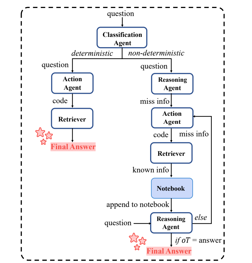 分类智能体(C-Agent):用于判定问题类型属于确定性或非确定性。确定性的问题可直接通过检索图信息来回答,而非确定性问题则需要在多个节点和关系间进行多跳推理。