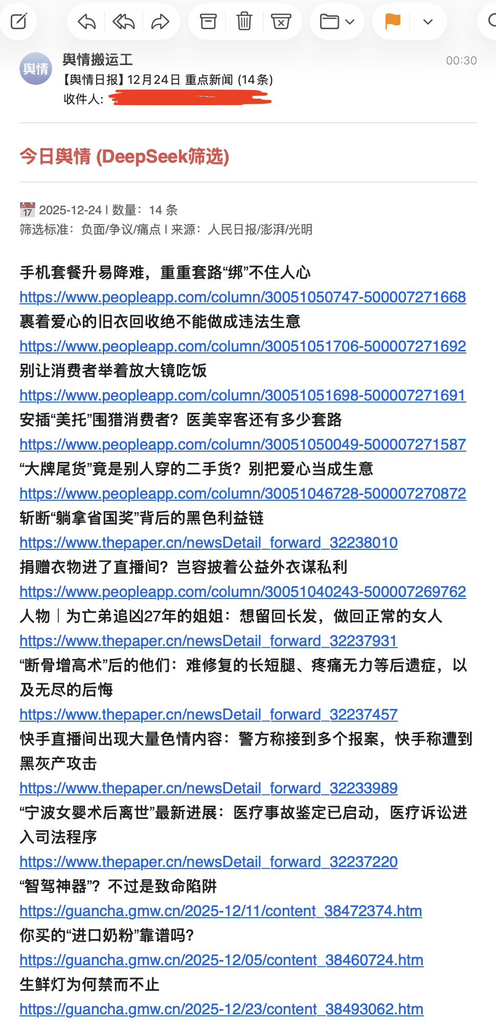 为了解决这个痛点,我利用 Python 和最新的 LLM(大语言模型)技术,给自己开发了一个“全自动舆情监测智能体(AI Agent)”。它能每天自动醒来,帮我搜遍人民日报、澎湃新闻、光明网,把真正值得关注的社会争议新闻发到我的邮箱里。