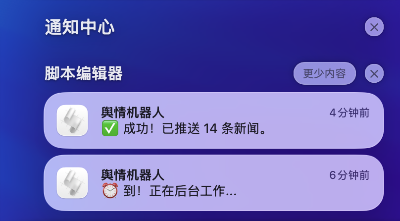 我遇到了 macOS “App Nap(应用小憩)” 的坑:不插电或后台运行时,系统会杀掉 Python 进程。 最终我通过编写 Shell 启动脚本 (start_bot.sh) 并结合 Automator 的日历触发器,成功实现了“静默运行”。现在,每天下午 4 点,它都会准时通过 Mac 通知中心向我汇报工作。
