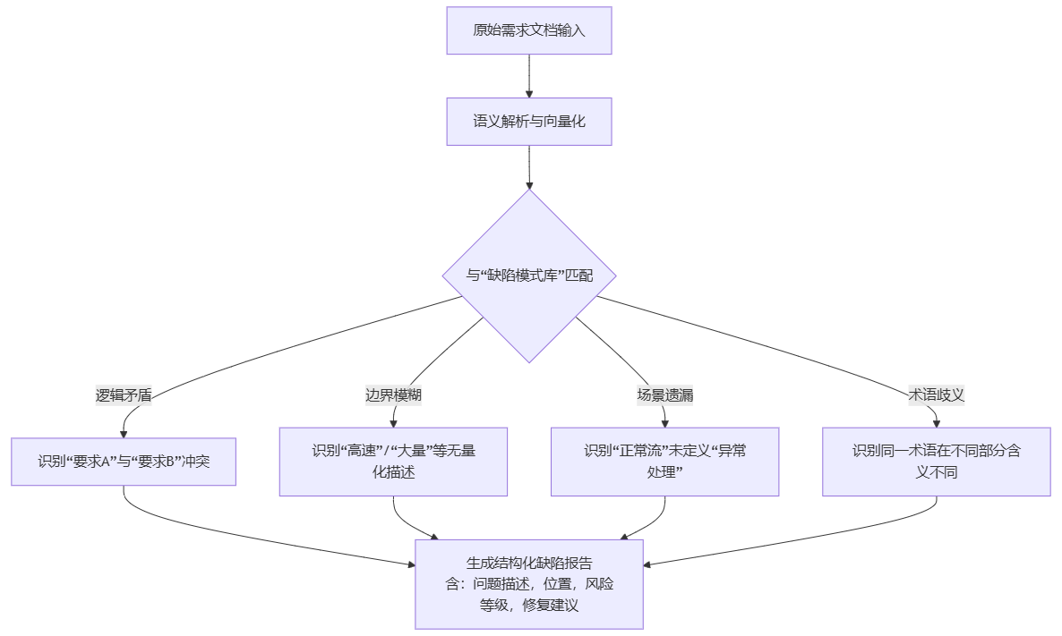 通过对公开及历史项目缺陷库的学习,大模型能够形成一个“缺陷模式矩阵”。当遇到新的需求描述时,它会进行模式比对。这个过程可以直观地通过以下流程来理解: